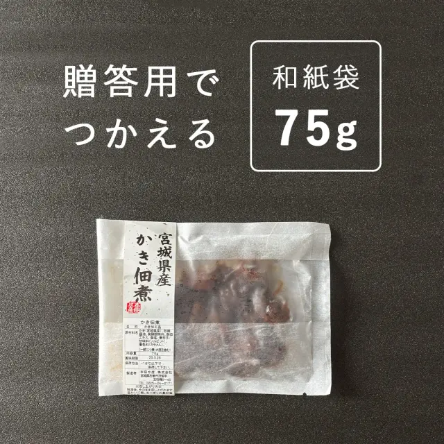 かき(宮城県産)、砂糖、醤油、発酵調味料、食塩、酵母エキス、唐辛子、デキストリン/甘味料(ソルビット)、着色料(カラメル)、(一部に小麦・大豆を含む)