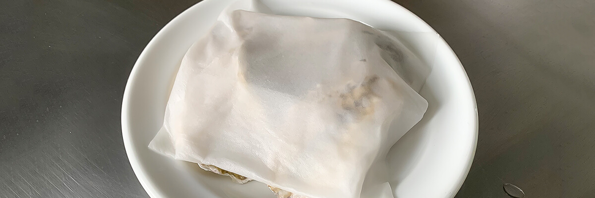 ふんわりラップをすることで、蒸し焼きにしつつ殻の破裂をしにくくしています。