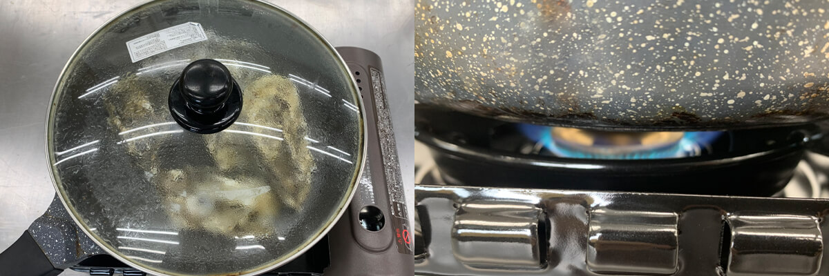 この工程は加熱ムラをへらすための工程なので、牡蠣が解凍できるくらいでOK!